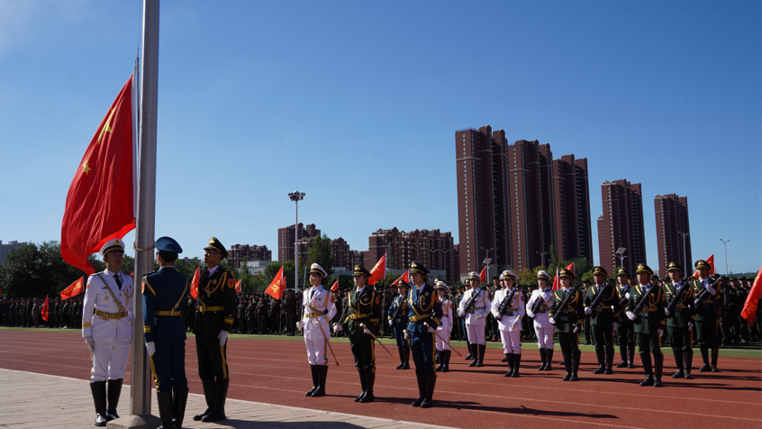开营仪式上,国旗护卫队迈着整齐的步伐,护送国旗入场,全体师生肃立,奏唱国歌。