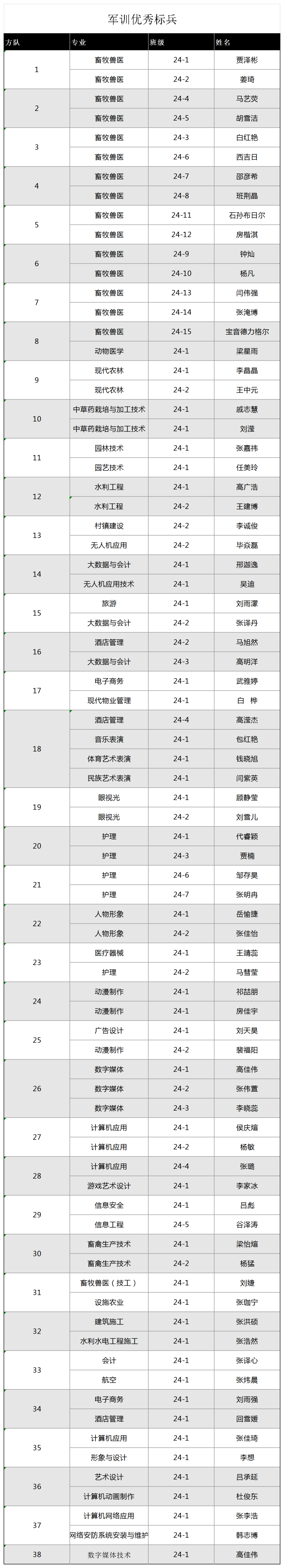 军训优秀标兵名单