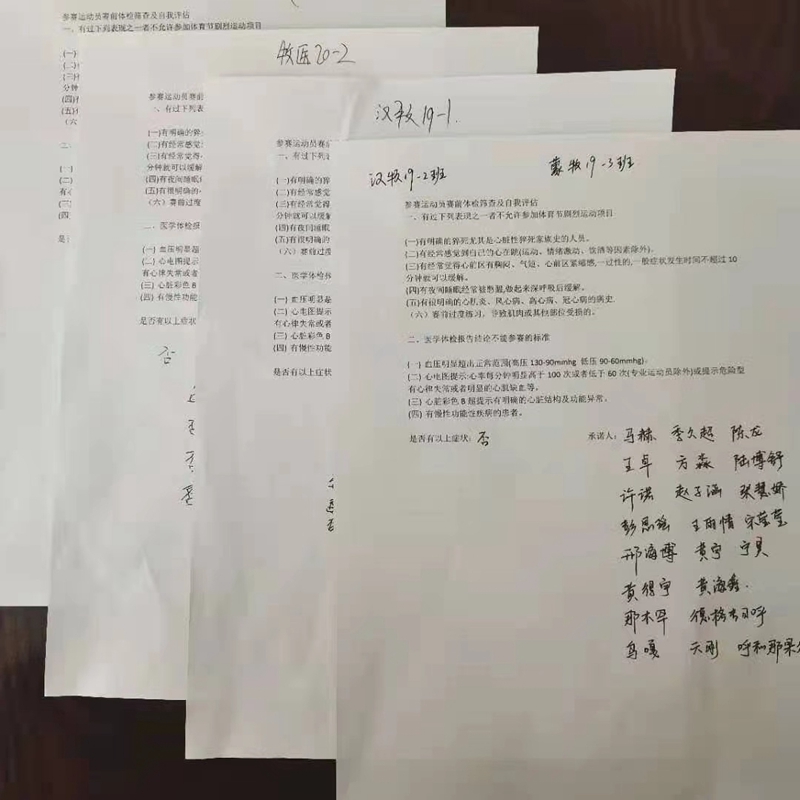 活动结束当晚,各班级对每名参赛人员身体状况进行彻底摸查,并让所有运动员均在赛前体检筛查表和自我健康评估表上签字;组织各班安全员进行基本培训和岗位职责划分。