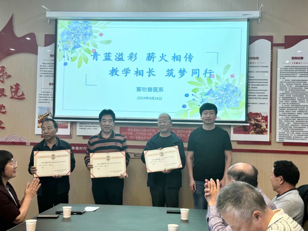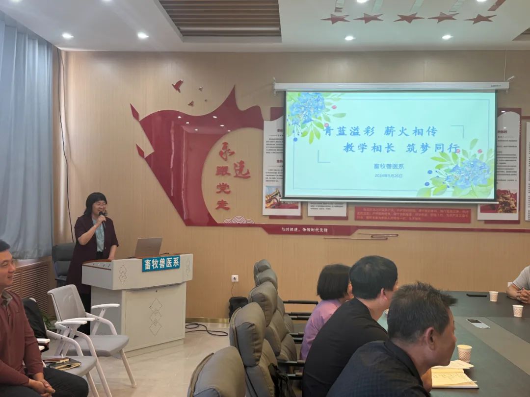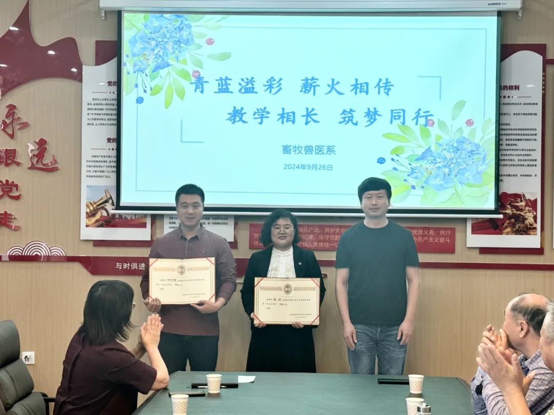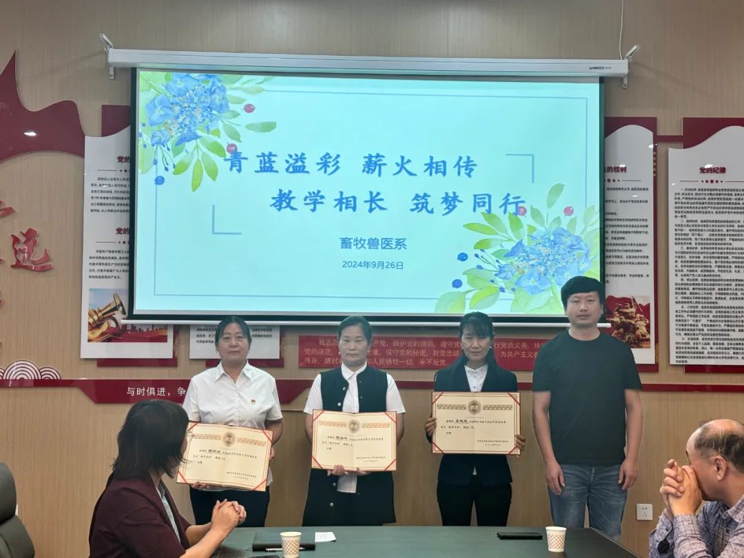 以心携新,青蓝相聚,共育满园桃李。为深入贯彻落实党的二十大精神,加强教师队伍建设,促进青年教师全面发展,充分发挥优秀教师的示范和引领作用,弘扬践行“传、帮、带”精神,提高畜牧兽医系教育教学质量。9月26日,畜牧兽医系党支部在牧韵楼举行了2023-2024学年“青蓝工程”成果总结大会暨畜牧兽医系新入职教师“青蓝工程”师徒结对仪式。