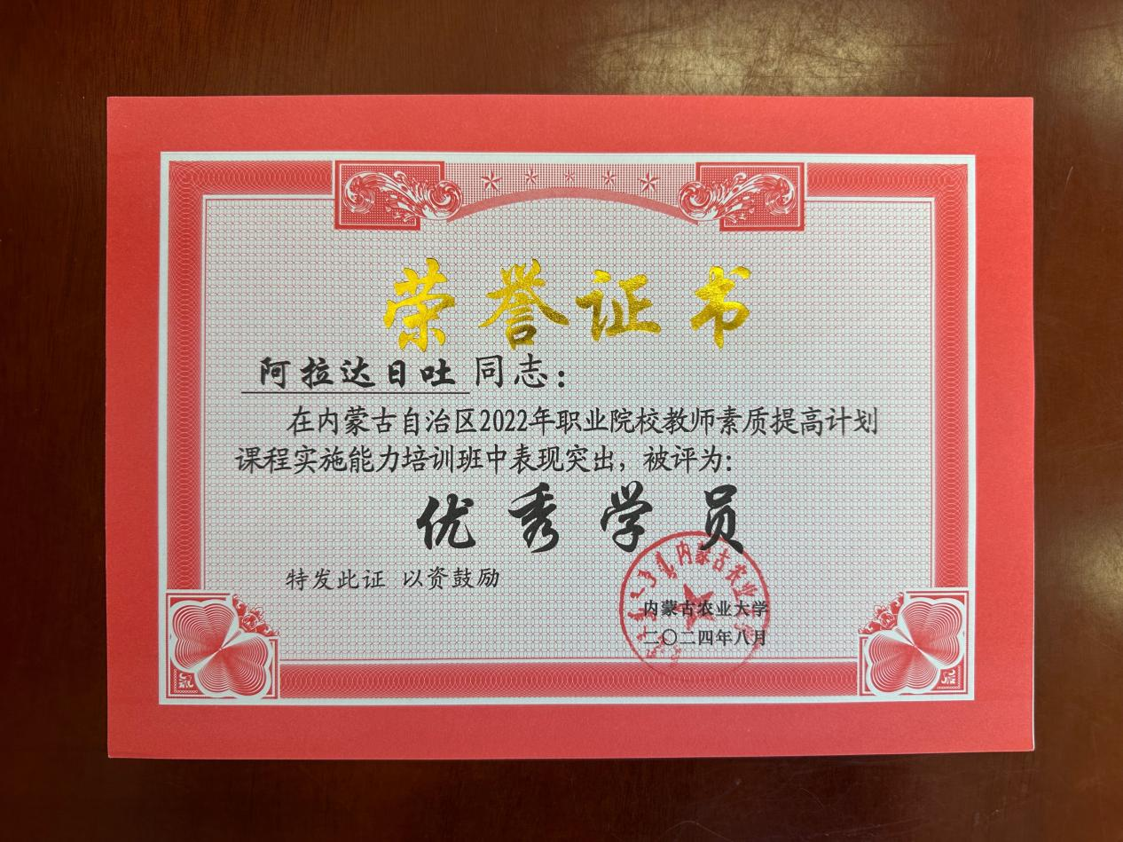 在内蒙古教育厅主办的2022年职业院校教师素质提高计划——高职课程实施能力提升培训班中,阿拉达日吐和王婉莹两位教师荣获“优秀学员”称号。此次国家级培训由内蒙古农业大学职业学院承办,旨在提升教师的课程实施能力,促进职业教育质量的全面提升。